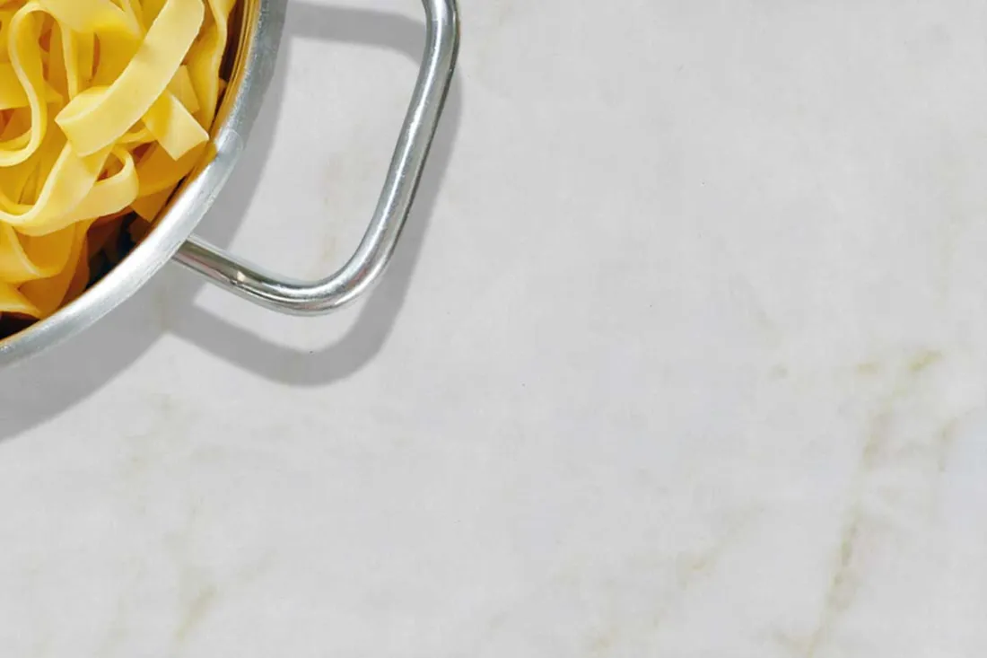 besticht durch einen hellen, elfenbeinweißen Grundton, der von feinen gold- und grauen Aderungen durchzogen wird. Die marmorne Optik wirkt edel und ruhig, ideal für Küchen oder Bäder, in denen Helligkeit und Eleganz dominieren.