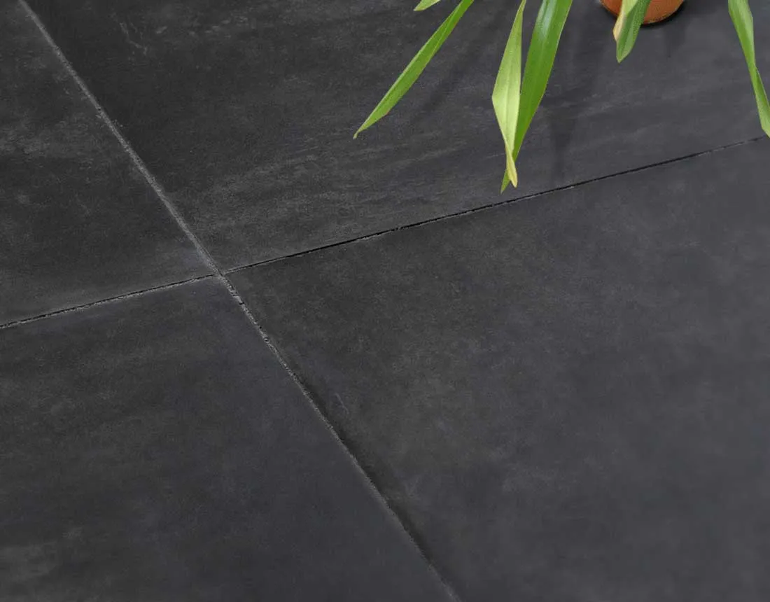 Die EMPEROR Brooklyn ist eine keramische Terrassenplatte aus Feinsteinzeug in Sichtbeton-Optik mit sehr dunklem, dunkelanthrazitfarbenem Farbton und quadratischem Format. Sie ist in drei Varianten erhältlich: 80 × 80 × 2 cm in der EMPEROR-Urban-Serie sowie 60 × 60 × 3 cm und 80 × 80 × 3 cm als EMPEROR Urban 3.0. Alle Varianten haben rektifizierte Kanten — maßgenaue, gratfreie Kanten, die eine fugenexakte Verlegung ermöglichen und leicht gefast.