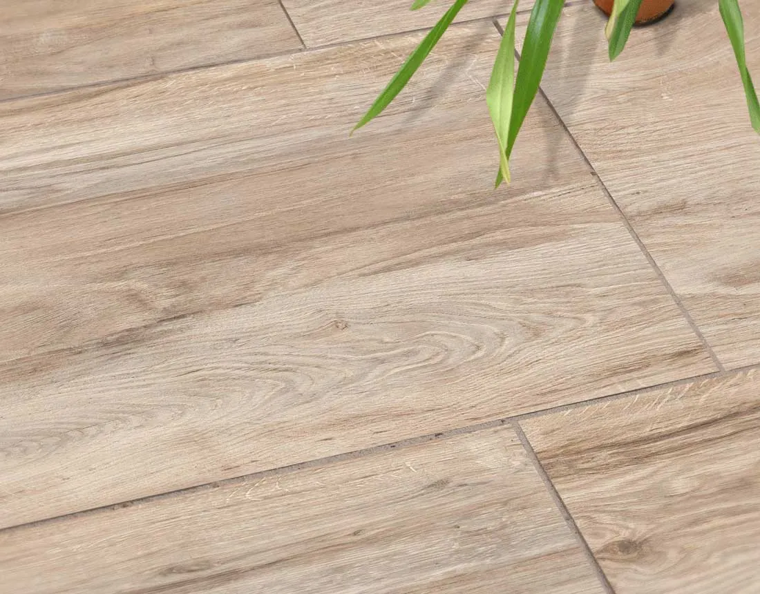 Feinsteinzeug — auch als Porzellansteinzeug bezeichnet — wird bei über 1.200 °C gebrannt. Der dabei entstehende Sinterprozess ergibt ein dichtes Material mit einer Wasseraufnahme von weniger als 0,5 Prozent, was die Basis für die Frostbeständigkeit ist. Das Dekor Champagne gibt helle, klare Holztöne mit feiner Linienführung wieder — in Optik und Oberflächenstruktur an Holz angelehnt, ohne dessen Witterungs- und Pflegeempfindlichkeit.