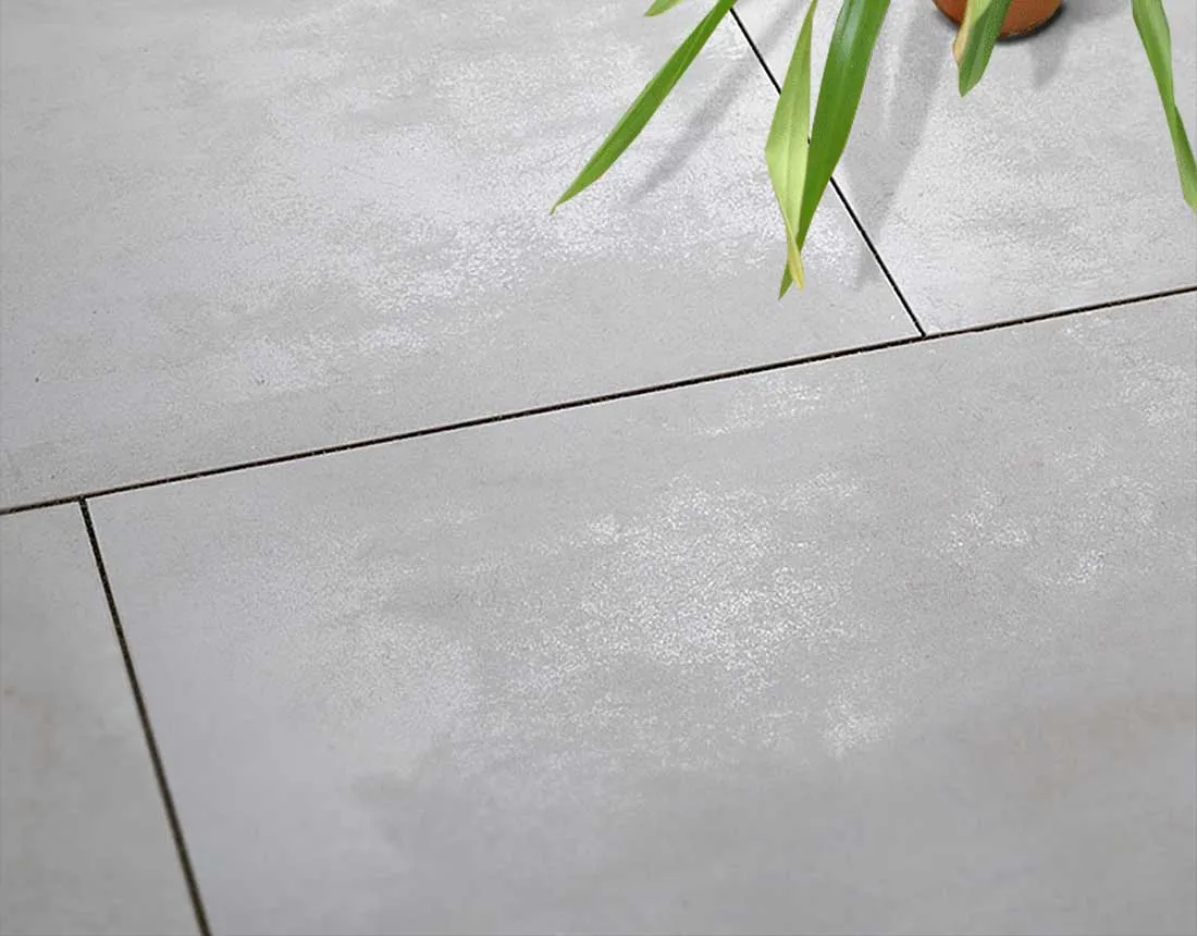 Die Platte wird im Vollflächenmörtelbett auf einem frostfreien, tragfähigen Untergrund verlegt. Das –5-mm-Untermaß der rektifizierten Kante ergibt beim Verlegen automatisch eine 10-mm-Fuge. Für Zuschnitte eignet sich Diamantwerkzeug für Keramik; für präzise Schnitte steht das Wasserstrahlschneidverfahren zur Verfügung. Beim Großformat 120×60 ist eine besonders planebene Unterkonstruktion wichtig, da sich Unebenheiten bei großen Plattenformaten stärker abzeichnen als bei kleinen. Eine ausführliche Anleitung finden Sie hier: → www.naturstein-online-kaufen.de/info/terrassenplatten-verlegen.html