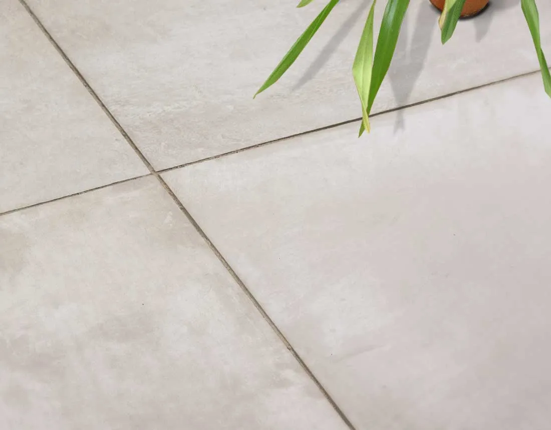 Feinsteinzeug wird aus kalkarmen Tonen, Quarz und Feldspat bei über 1.200 °C gesintert. Die dichte Sinterstruktur hat eine Wasseraufnahme von unter 0,5 Prozent und ist damit frostbeständig. Das Metropolitan-Dekor bildet eine gleichmäßige Sichtbeton-Optik in Hellgrau ab — dauerhaft und ohne die typischen Pflegeanforderungen von echtem Beton (kein Versiegeln, kein Imprägnieren notwendig).