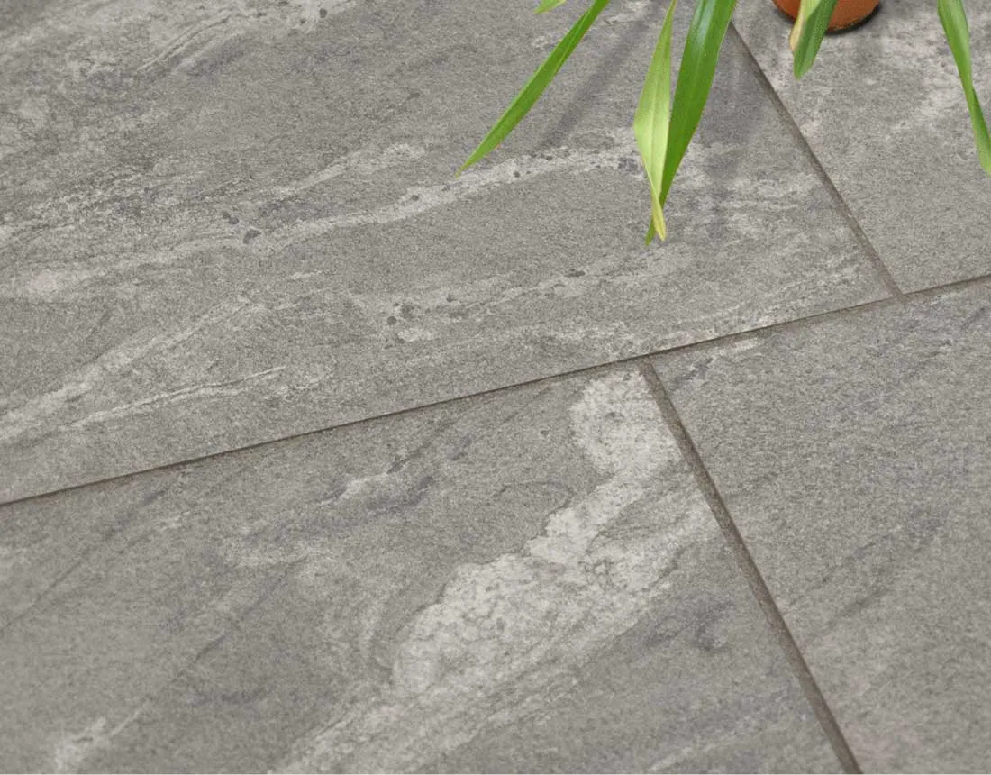 Feinsteinzeug wird aus kalkarmen Tonen, Quarz und Feldspat bei über 1.200 °C gesintert. Das Material ist monolithisch — alle Varianten einschließlich der 5-cm-Drive-Variante bestehen aus einem einzigen Keramikelement ohne aufgeklebten Betonträger. Die dichte Sinterstruktur erreicht eine Wasseraufnahme von unter 0,5 Prozent und ist damit frostbeständig und witterungsbeständig. Das Negro-Santiago-Dekor ist dauerhaft eingebrannt, ohne Versiegelung oder Imprägnierung.