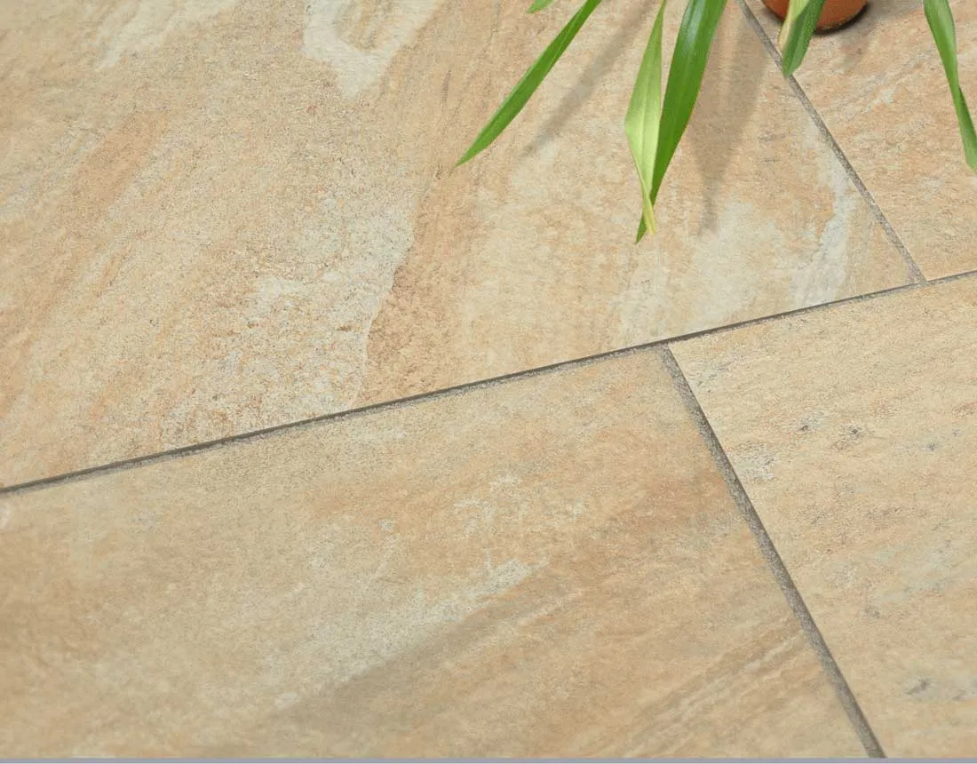 EMPEROR Rio Dorado ist ein Feinsteinzeug-Dekor der Marke EMPEROR® Outdoor Ceramics. Es zeigt hellbeige Sandtöne mit einem zarten Glimmereffekt, der durch den Brennprozess dauerhaft in die Plattenoberfläche eingebunden ist. Feinsteinzeug ist ein keramischer Werkstoff mit sehr geringer Wasseraufnahme und hoher mechanischer Festigkeit, der für den dauerhaften Einsatz im Außenbereich geeignet ist.