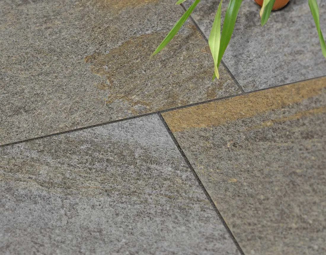 Feinsteinzeug wird aus kalkarmen Tonen, Quarz und Feldspat bei über 1.200 °C gesintert. Die dichte Sinterstruktur erreicht eine Wasseraufnahme von unter 0,5 Prozent und macht das Material frostbeständig. Das Valleverde-Dekor bildet die Oberfläche des Luserna Gneis Rossiccio nach — einem der ältesten Natursteine der Erdgeschichte, geprägt durch eine charakteristische grau-gelblich gemischte Textur mit silbrig schimmernden Glimmerlagen. Dieser Farbcharakter ist dauerhaft eingebrannt im Sinterprozess, ohne Versiegelung oder Imprägnierung.